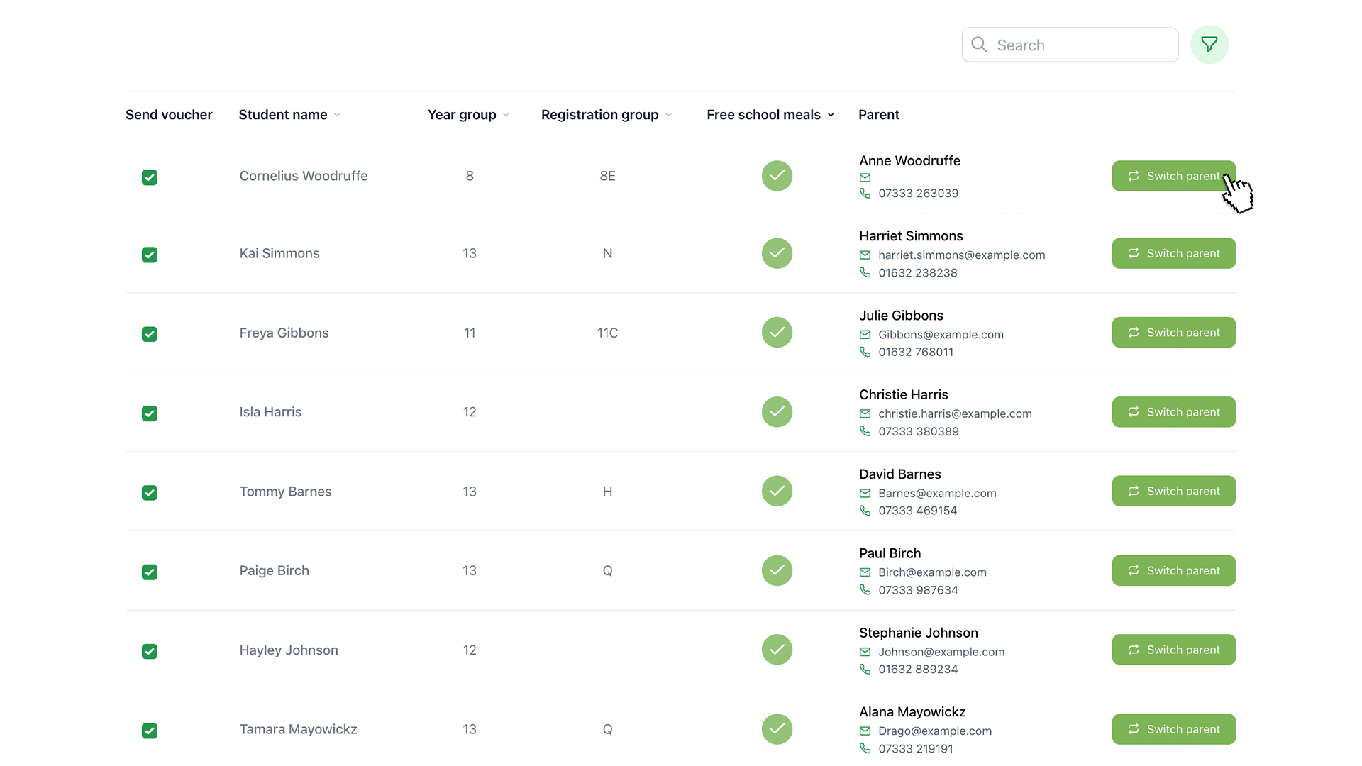 Find the student that you wish to switch the parents details for and then click on Switch parent on the right-hand side.