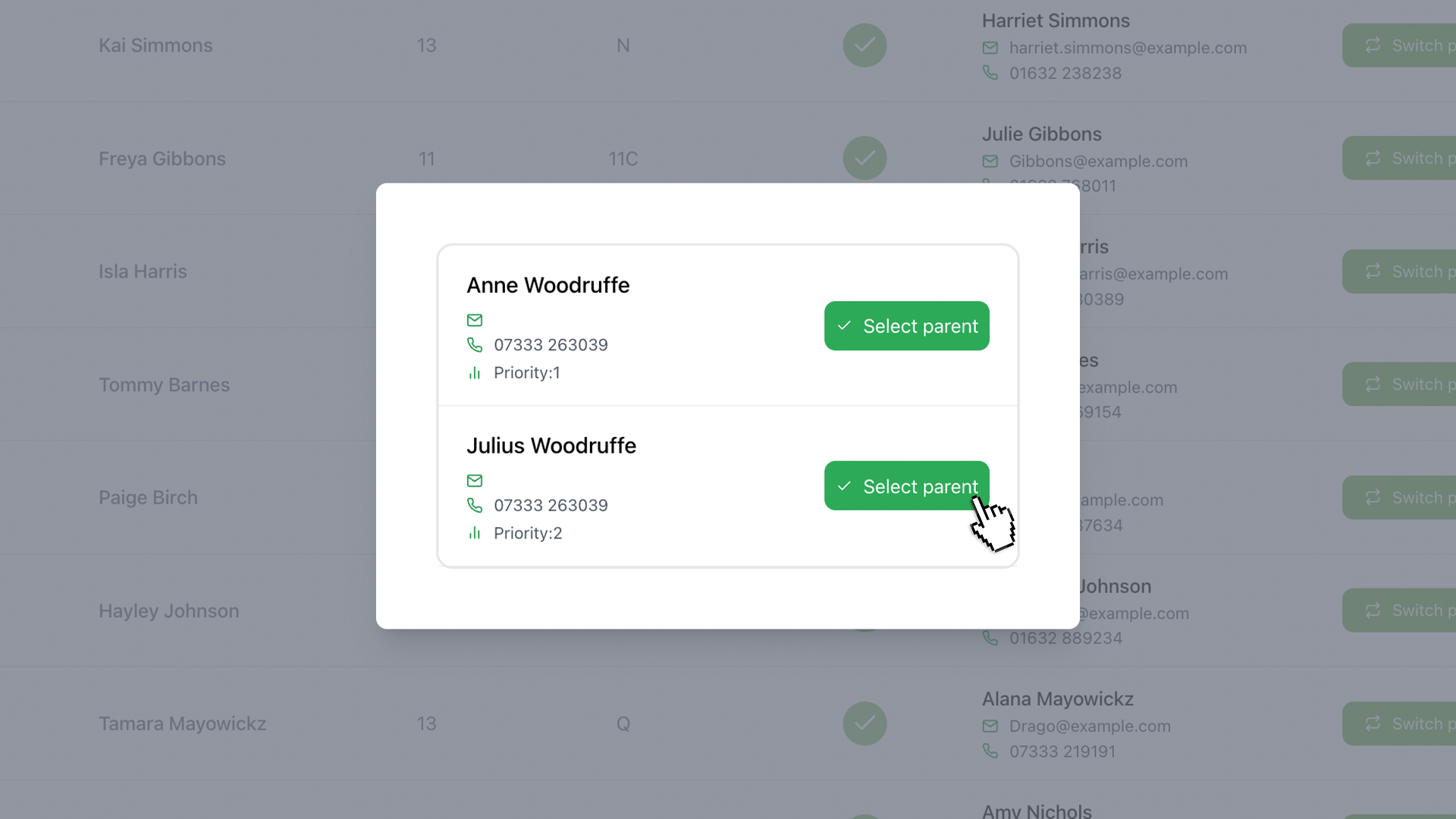Identify the parent that you would like to switch the voucher contact details to and click the Select parent button on the right-hand side.
