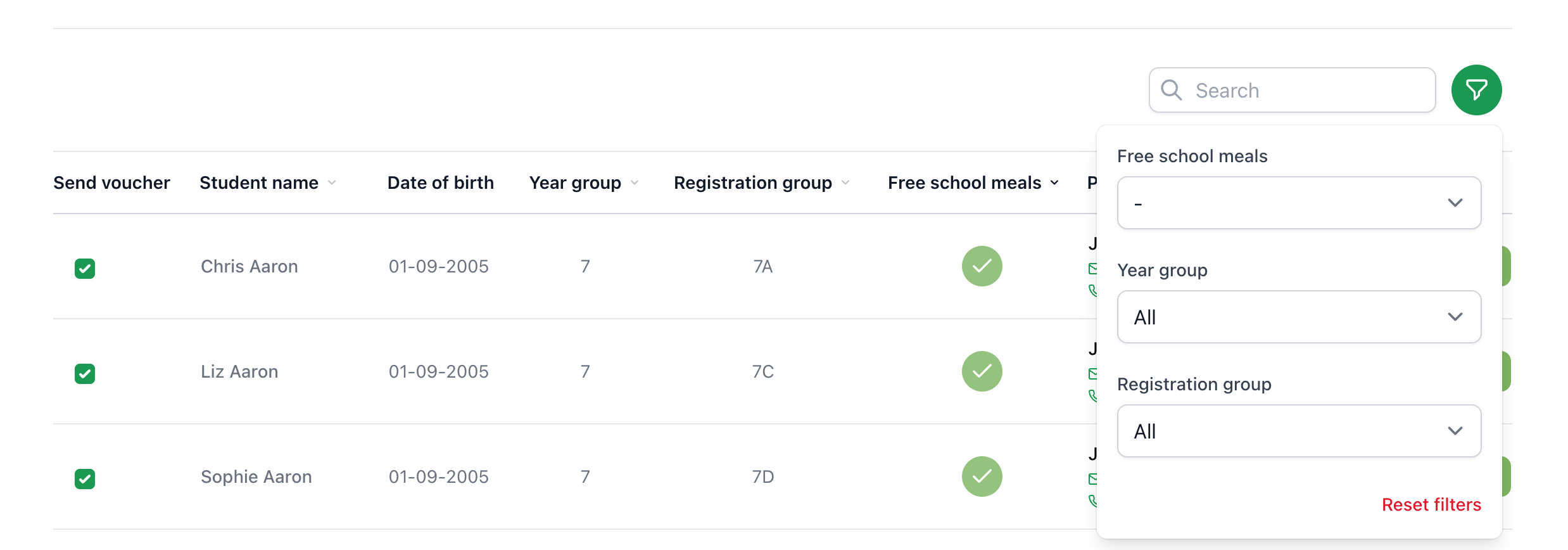 To locate non-FSM students, you can use both the search and filter functions. To search for an individual student, simply type their name into the search bar. To filter by non-FSM students, simply select the filter button and confirm 'No' for 'Free school meals'.