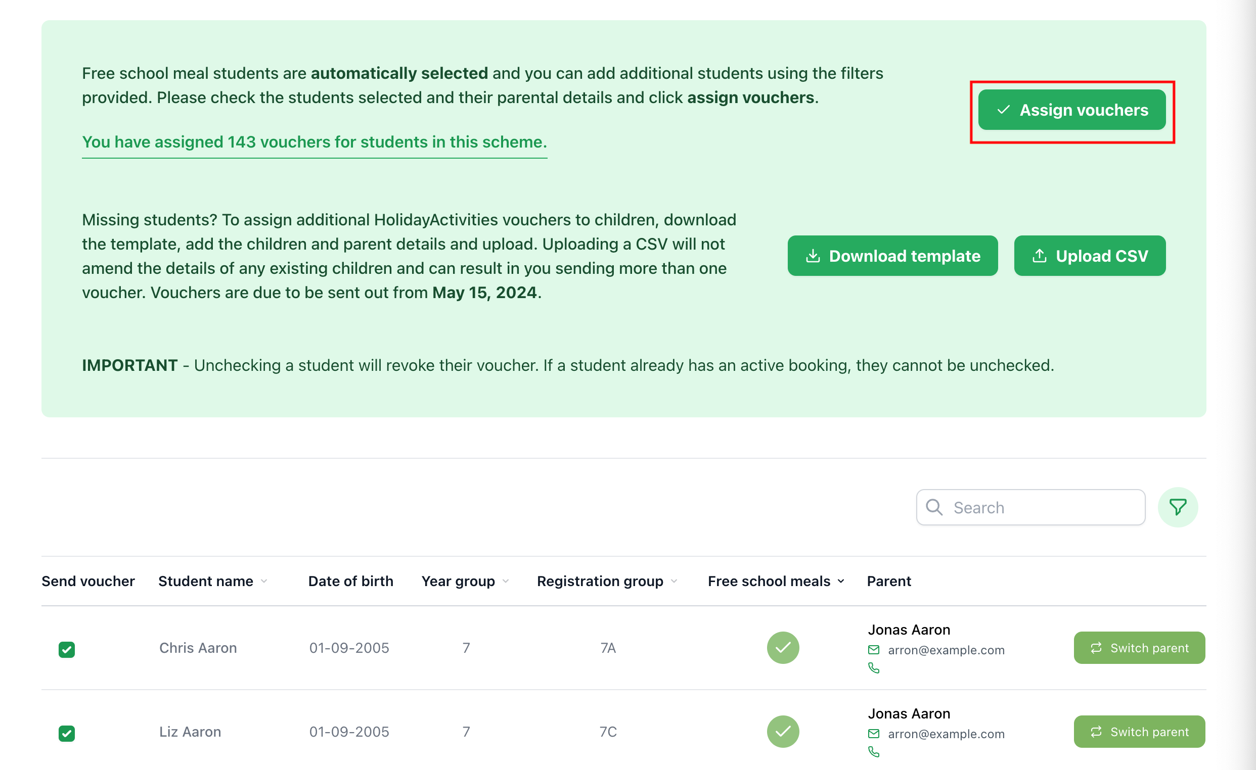Once finished, click 'Assign vouchers'. As above, please ensure that no existing students are un-ticked during this process.
