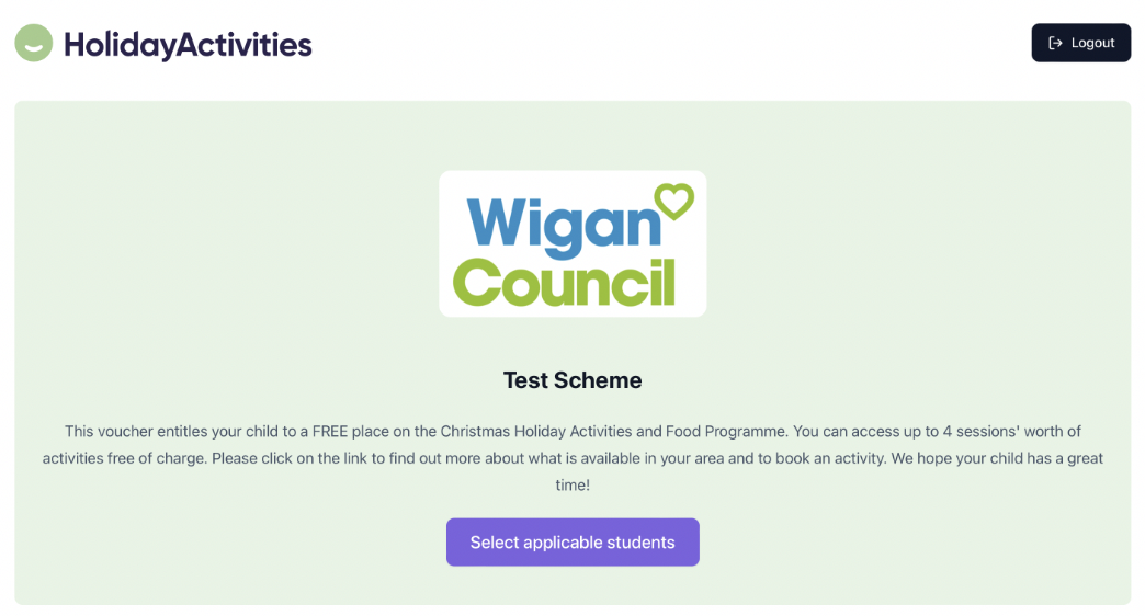 You'll then be taken into your HolidayActivities account where the HAF scheme will show, please click 'Select applicable students'.