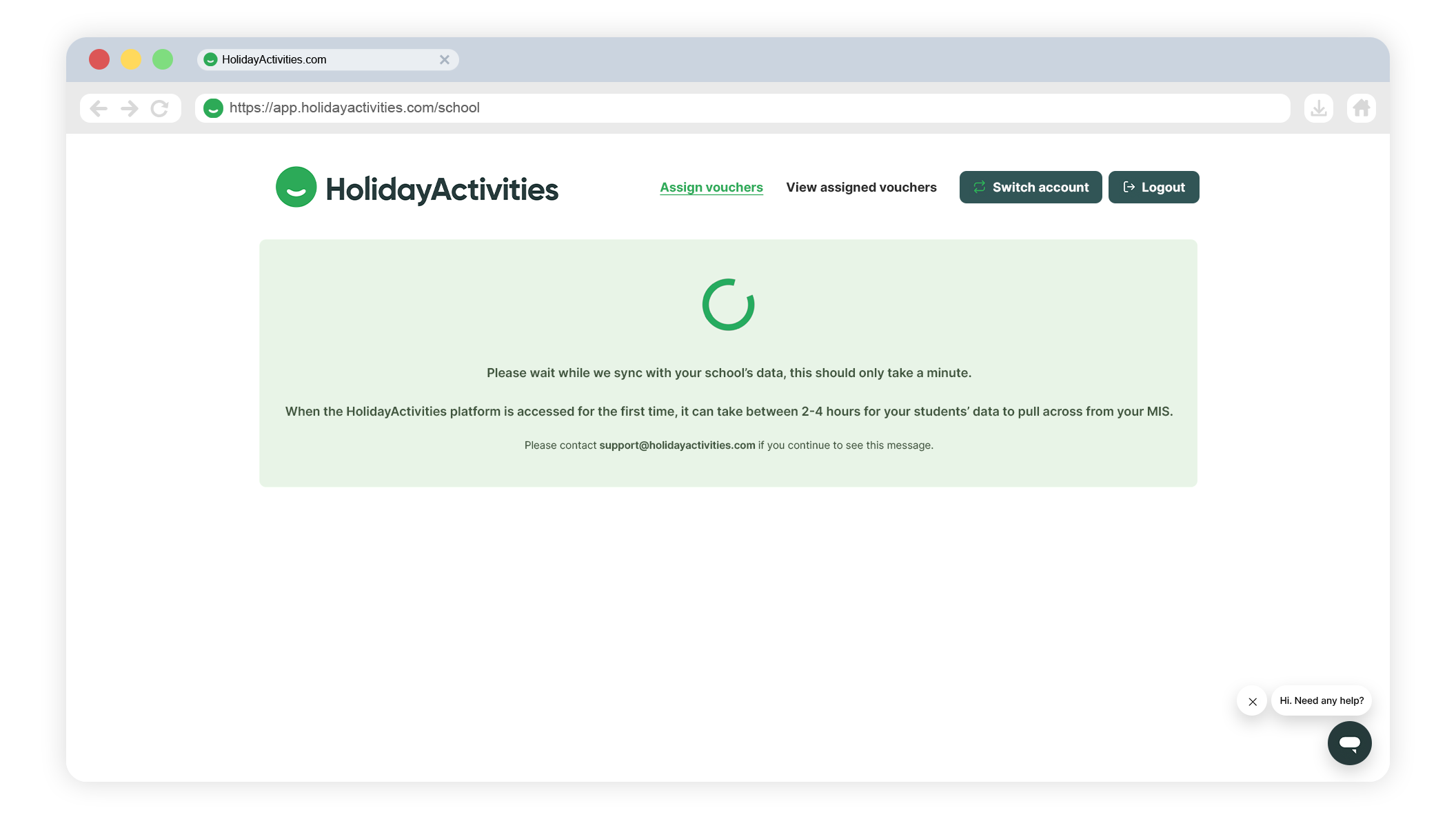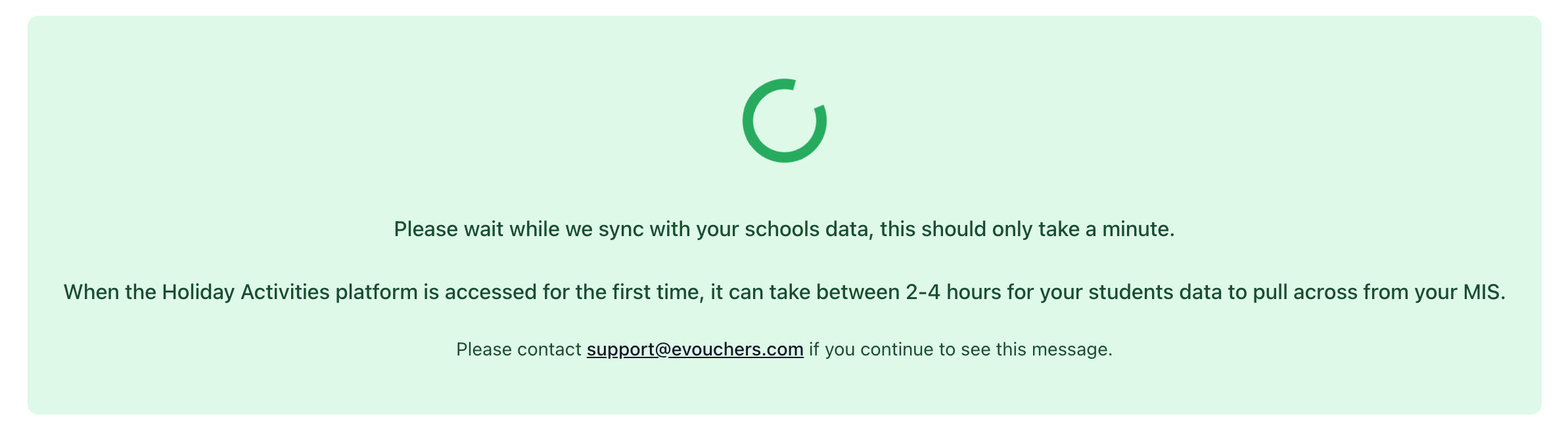Important: the following screen may show if we're syncing with your school data, it shouldn't take too long, but please email support@holidayactivities.com if you continue to see the message.