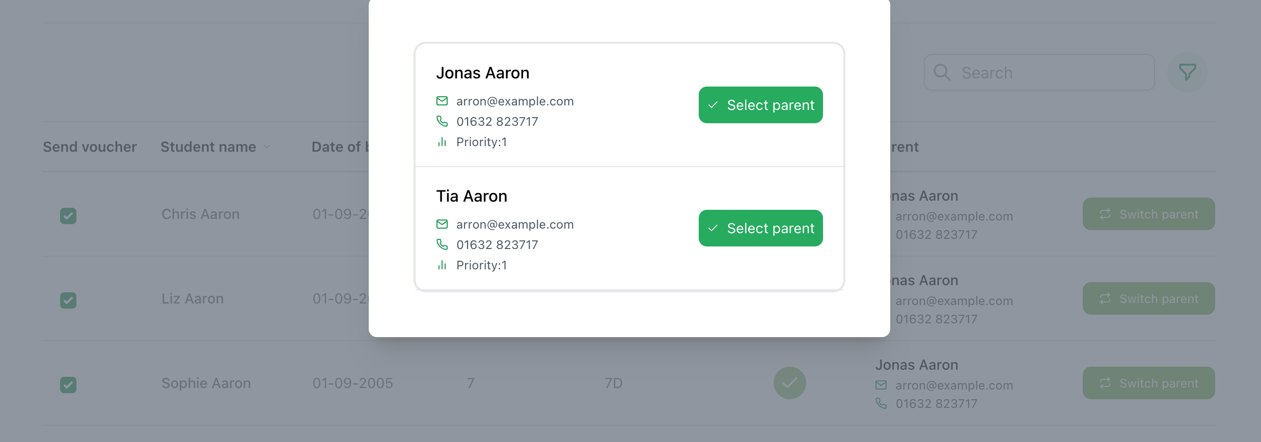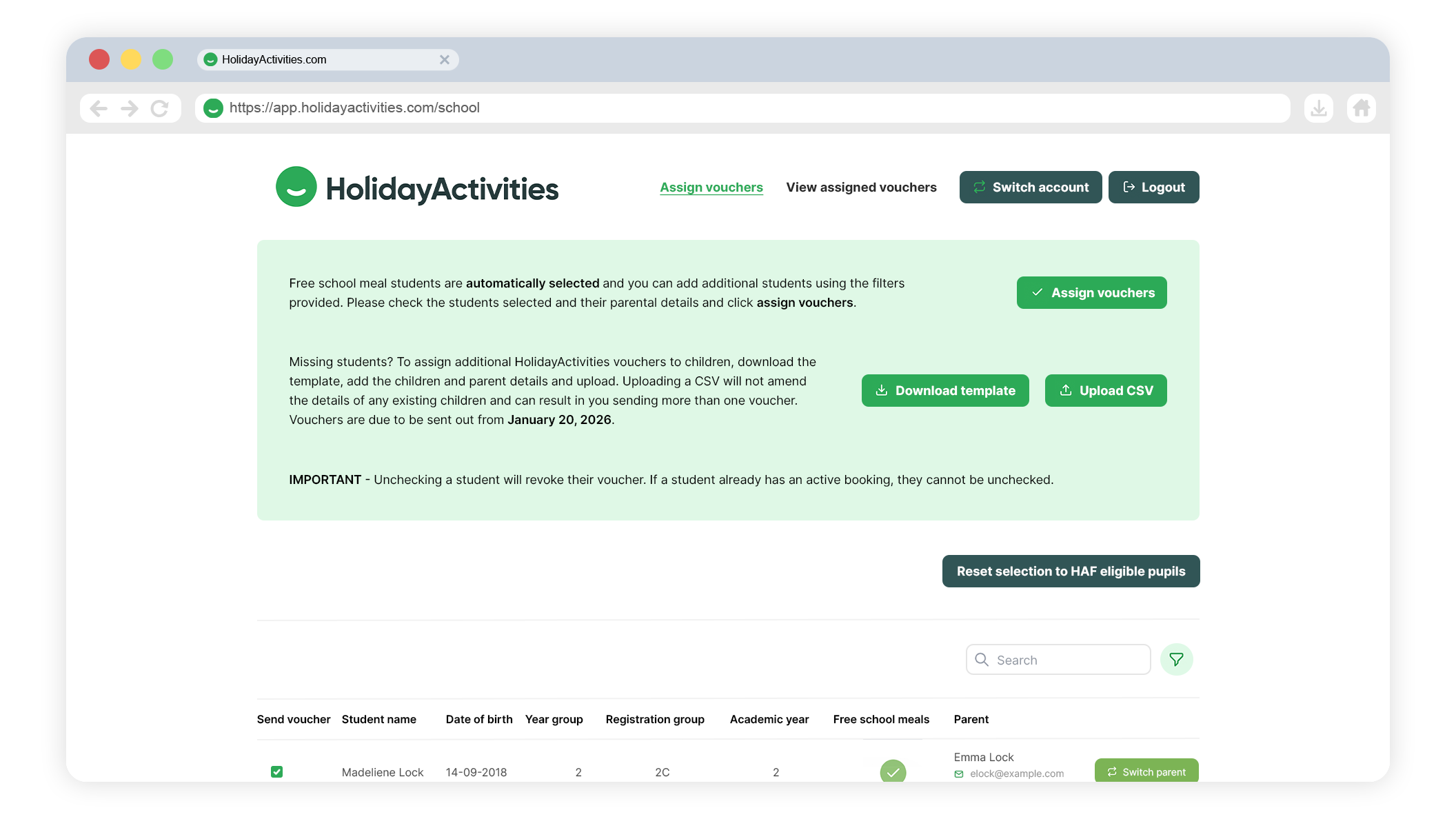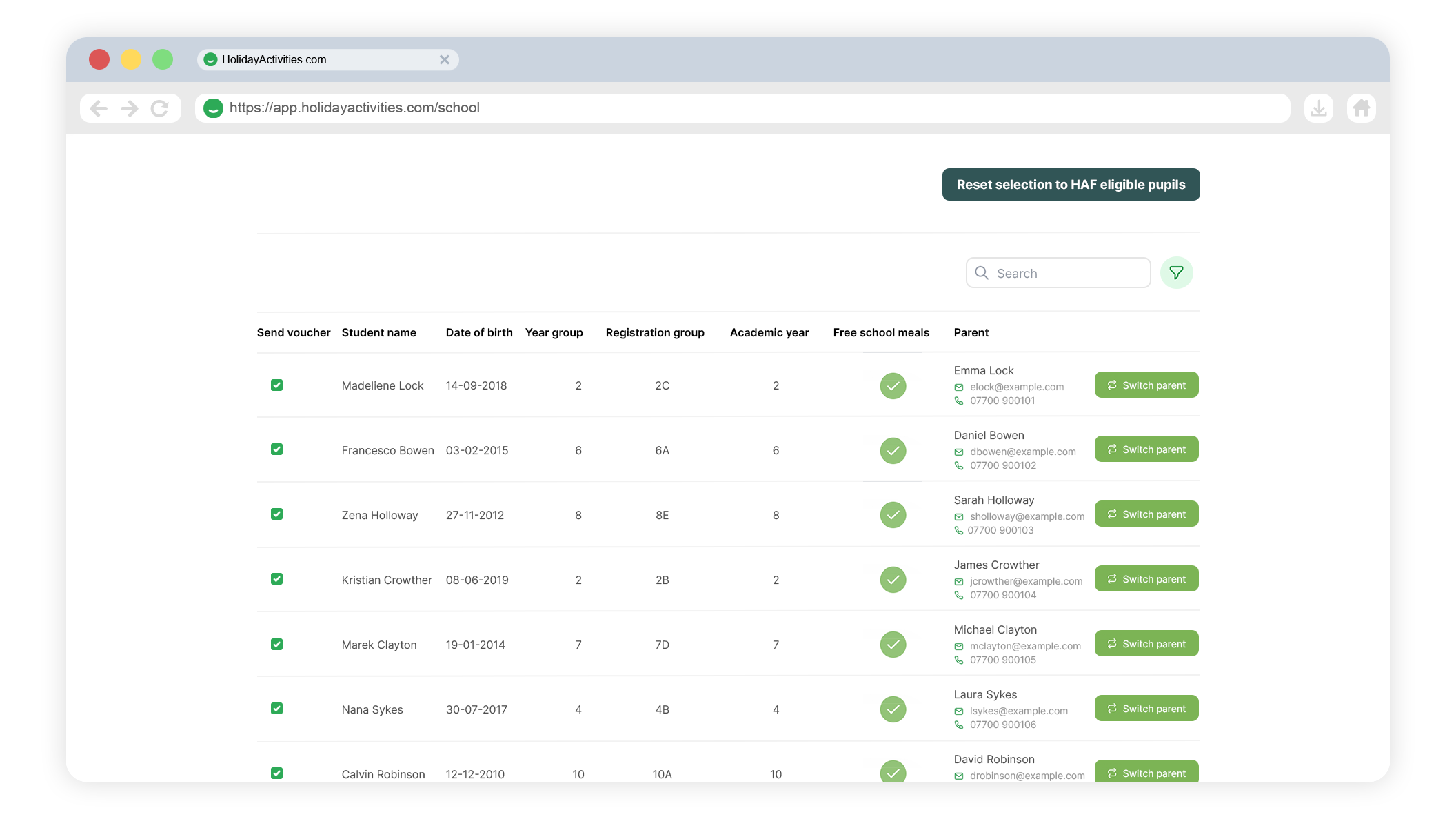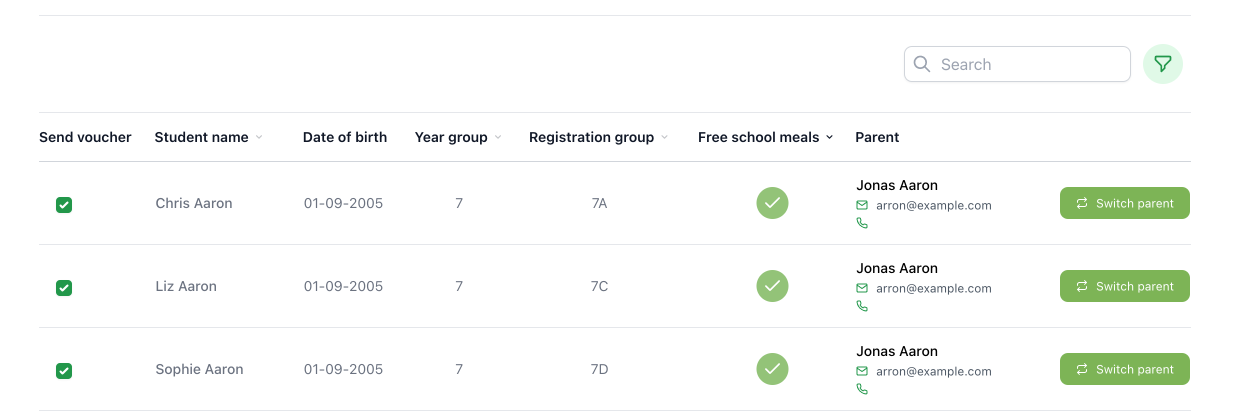 Please check the parental contact for each student and use the switch parent button to select a different contact. The toggle can be used to send vouchers to non-FSM students, simply search for the student and turn the toggle on.