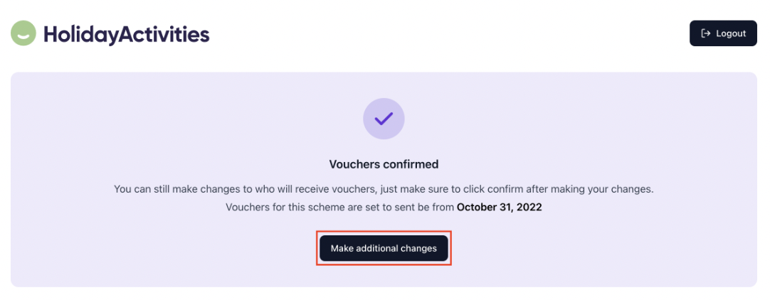 Your vouchers are now confirmed and will be sent on the scheme start date. Please note that this may be a date in the future if the Local Authority has requested all vouchers to be sent on the same day. you are able to make additional changes and send vouchers to more students by clicking 'make additional changes'.