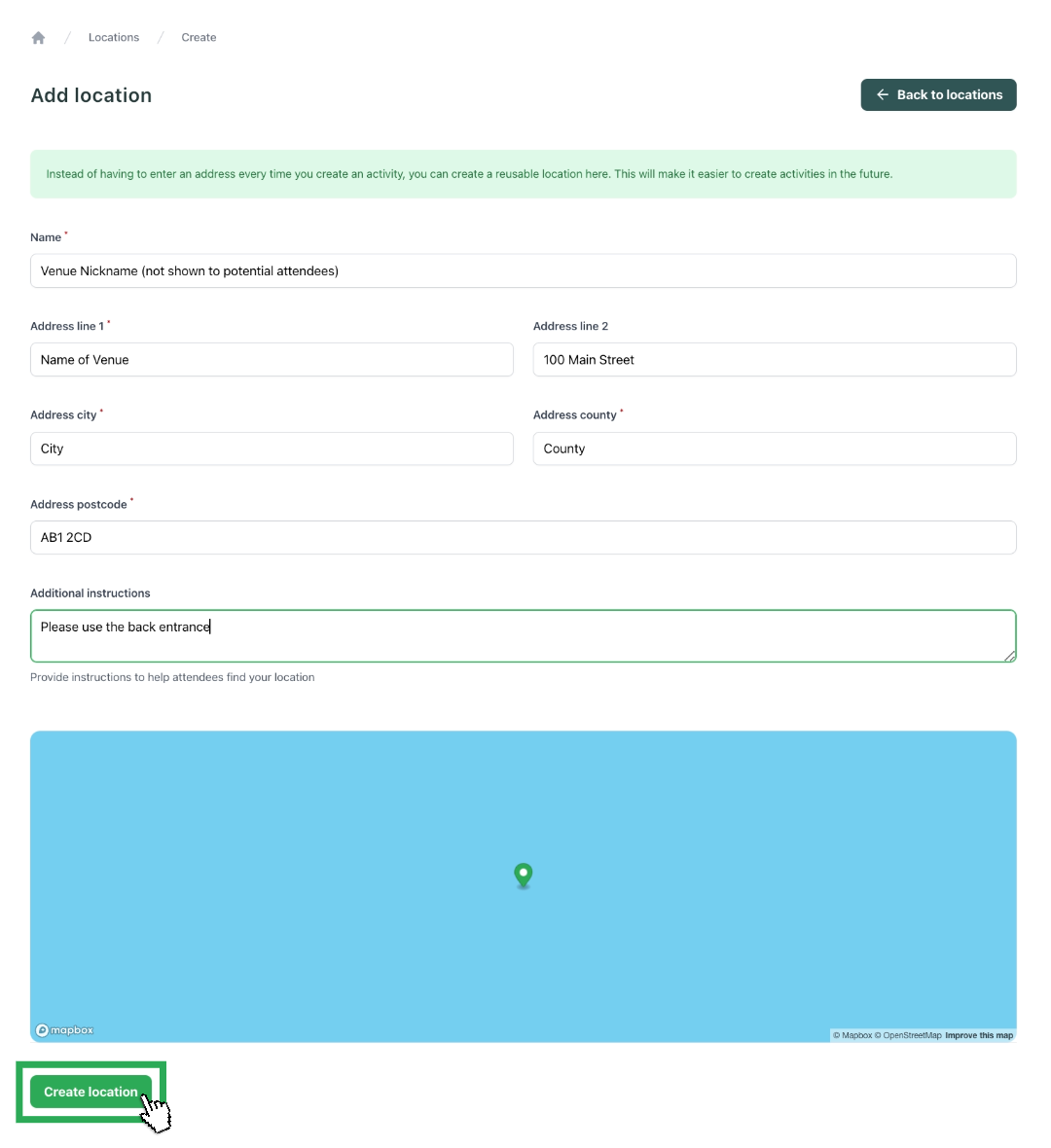 Complete the requested fields, when adding the post code, it will automatically find the location on the map. You can change or set the specific location by moving the purple location pin. When you have filled this in, click Create location.