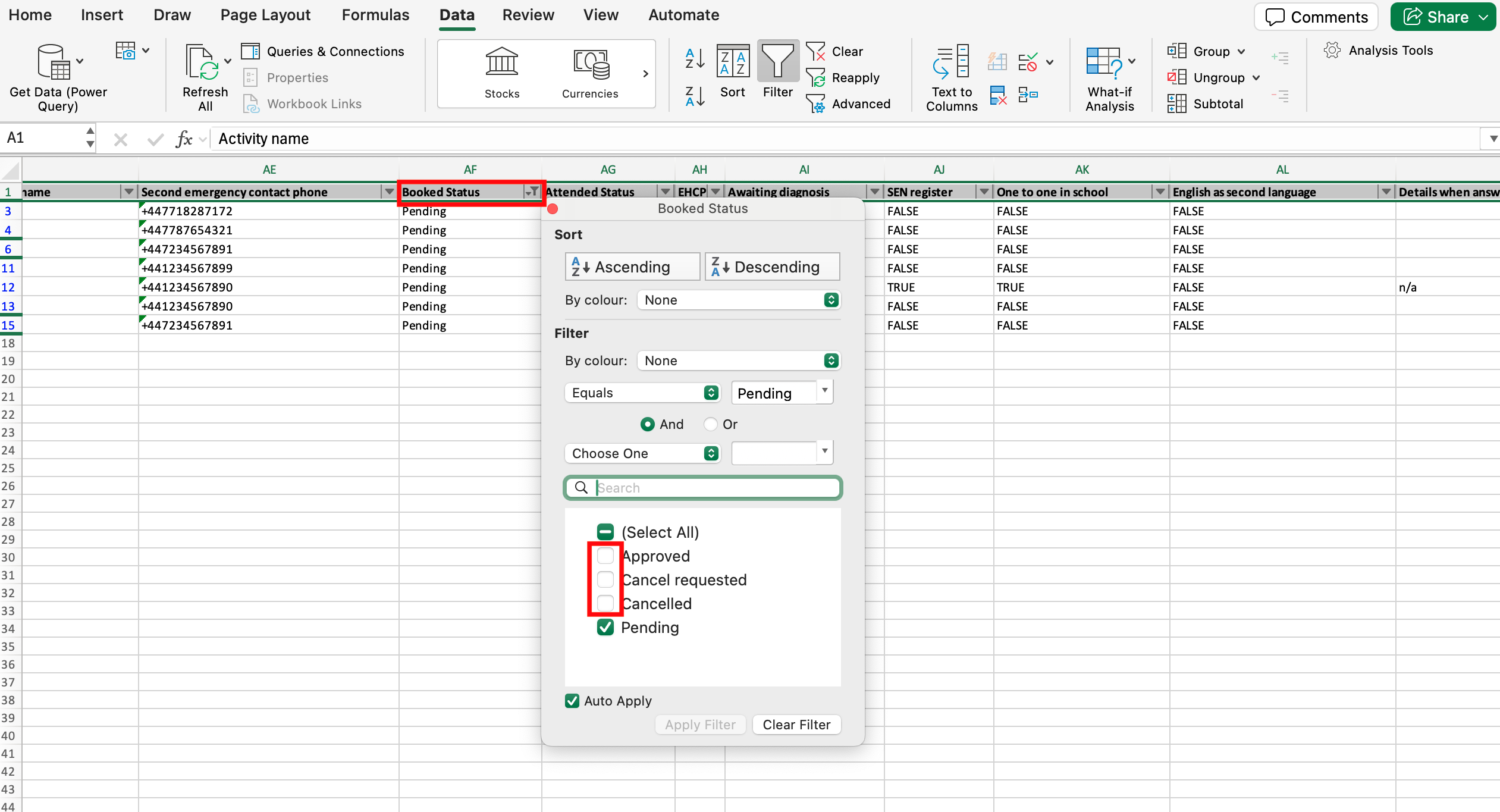 Filter the data to only show Pending bookings, click the down arrow in the Booked Status column and untick all statuses except Pending.