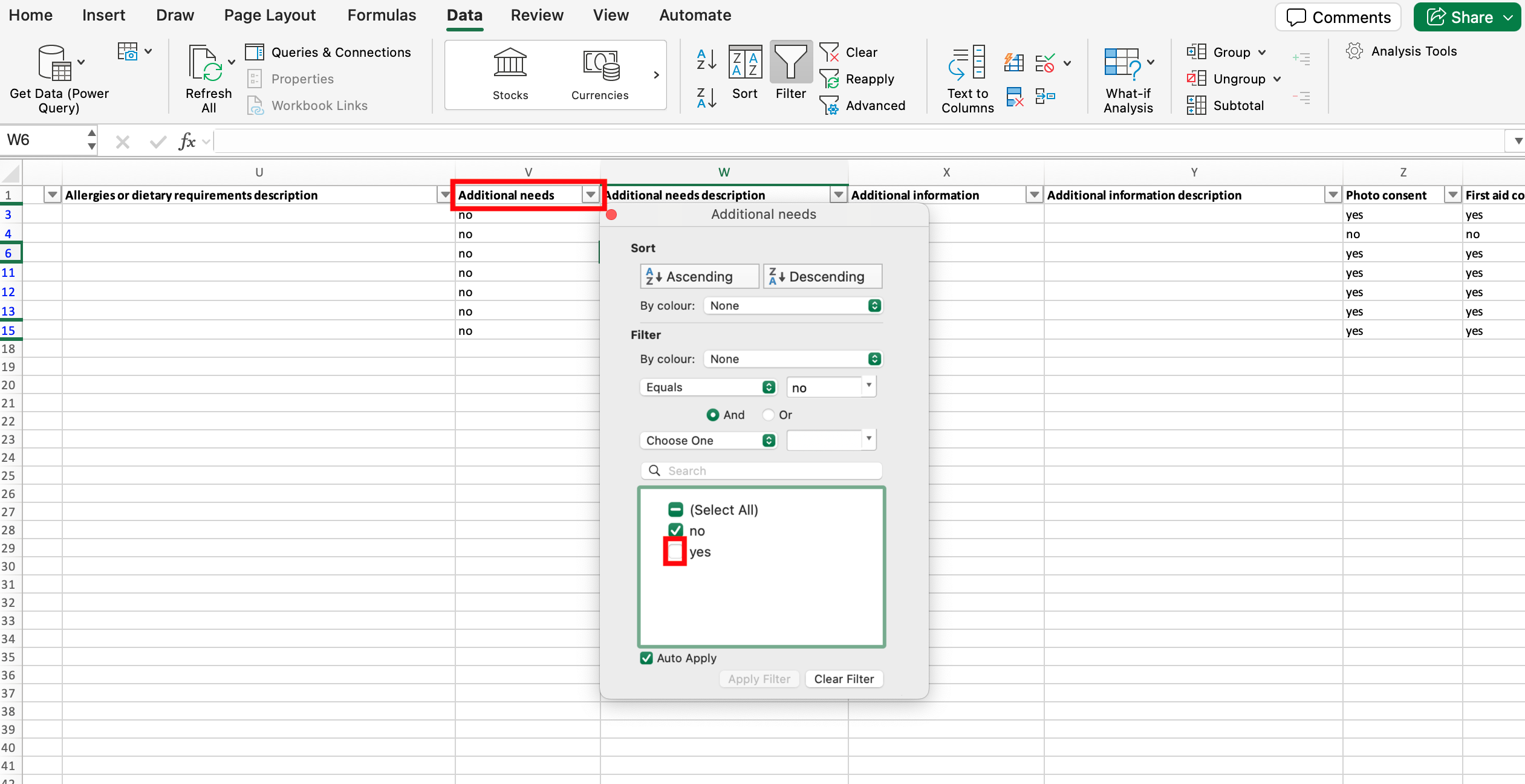 Filter again to only show attendees without additional needs, click the down arrow in the Additional needs column and untick Yes.