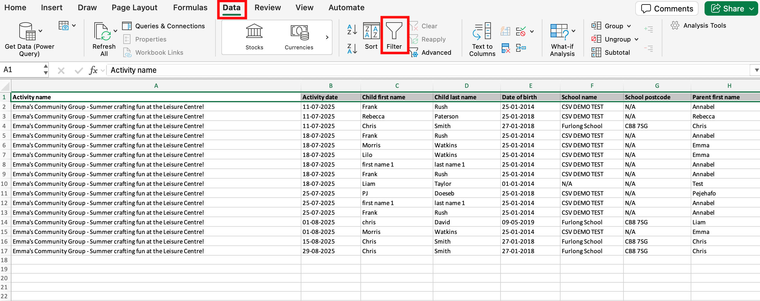 Open the file and apply a filter by selecting the Data tab and clicking filter.