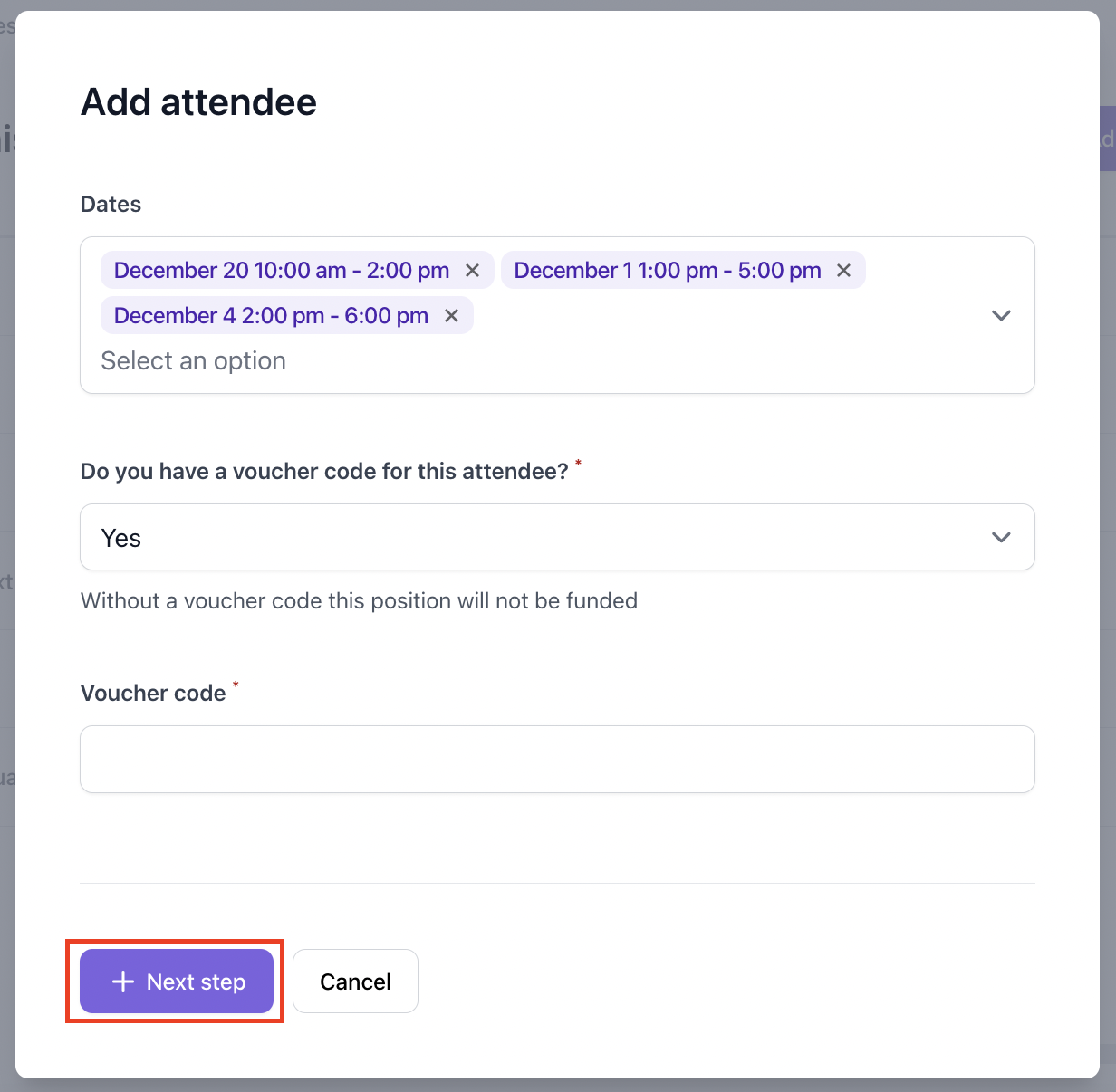 Choose the dates you would like to add the attendee on to the activity for, this can either be multiple dates or one. Then, select + Next step.