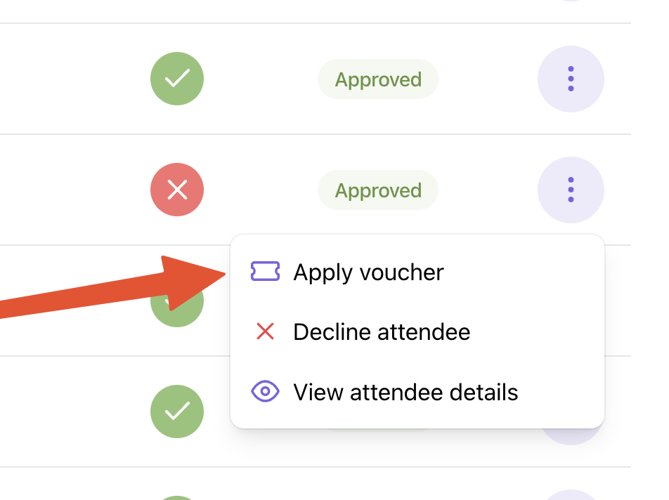 To add a voucher code after you have already added the attendee, select the three dots on the right hand side of the attendees name and select Apply voucher. You will then be able to add the voucher code and select Apply voucher.