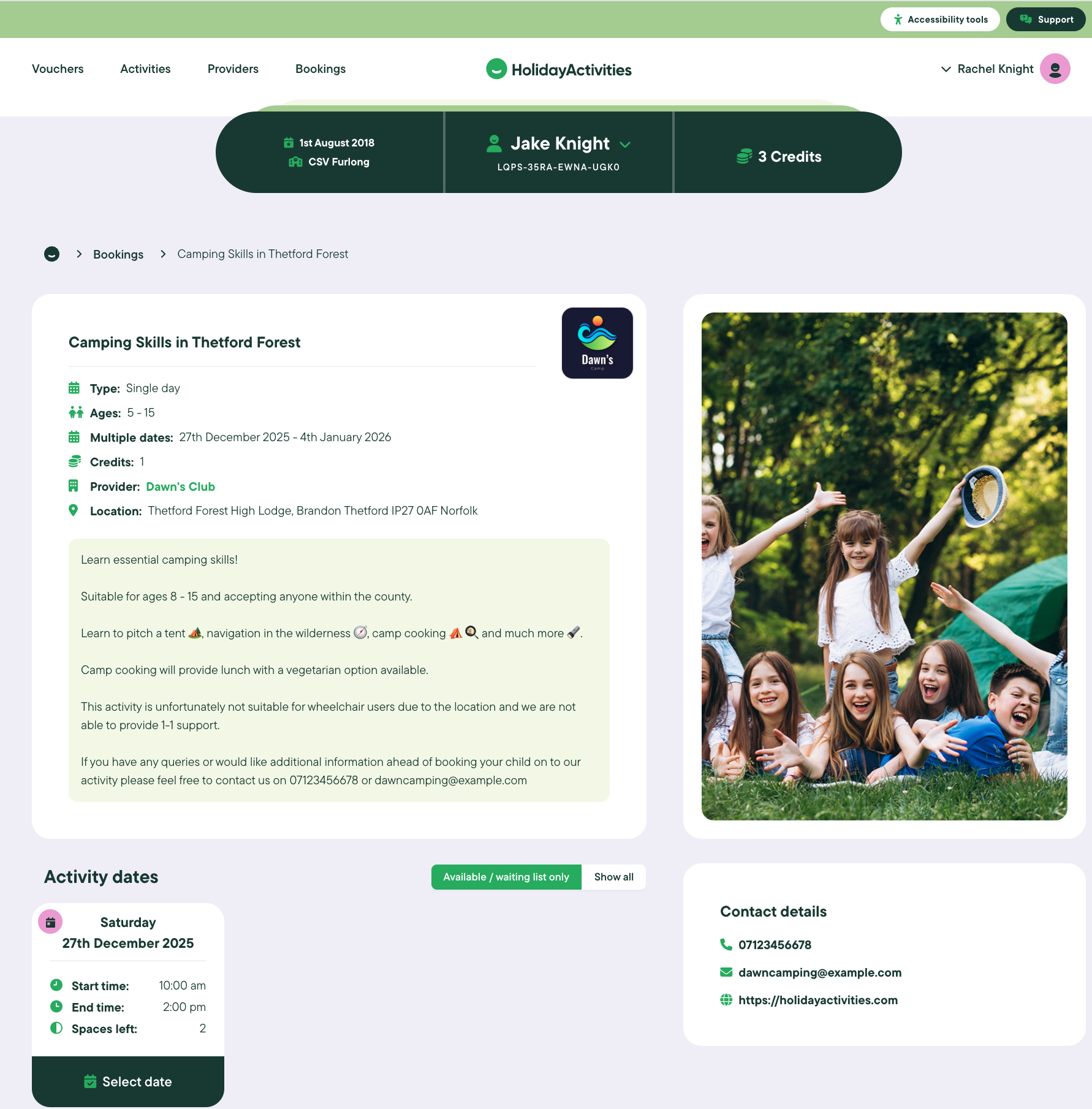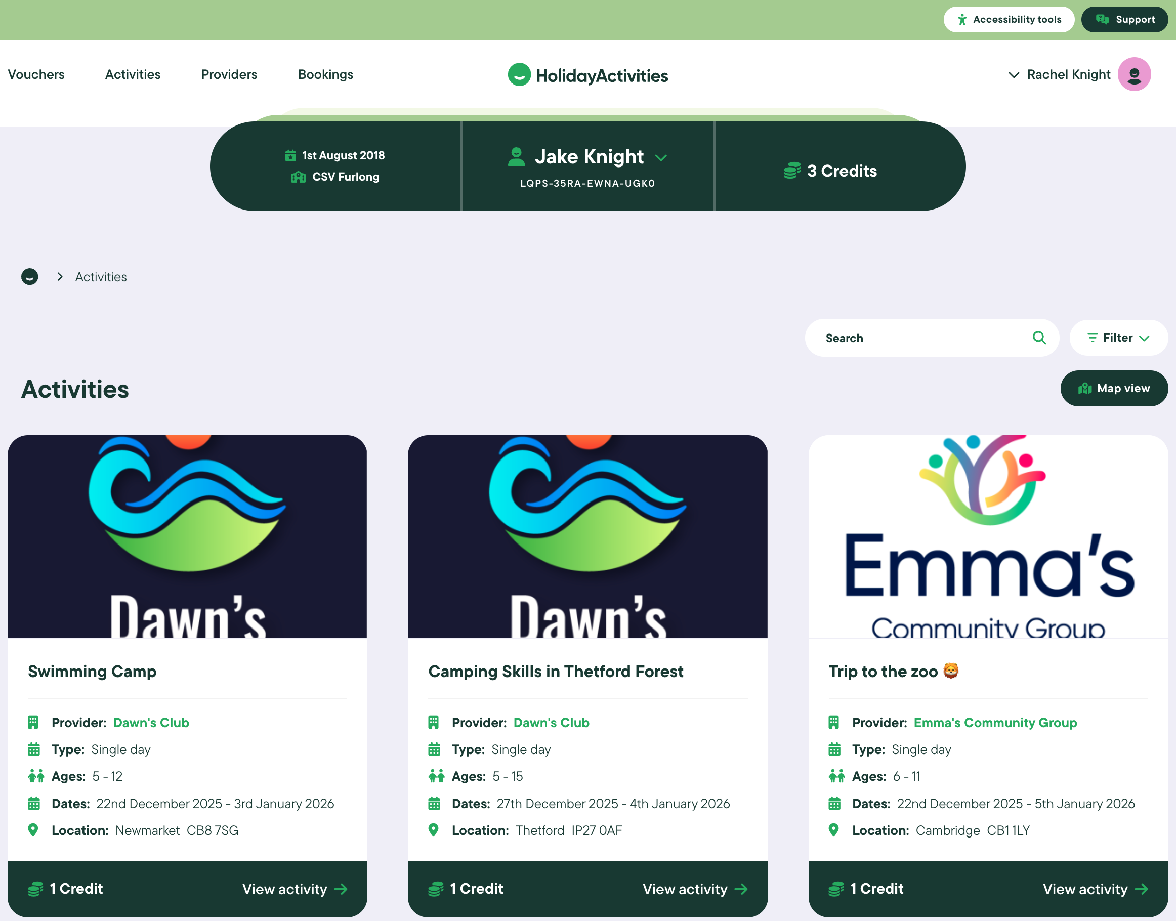 Click Select voucher for the child you wish to book activities for.