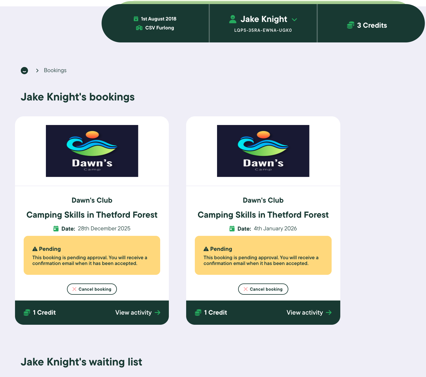 Waiting list bookings will display underneath completed and pending bookings.