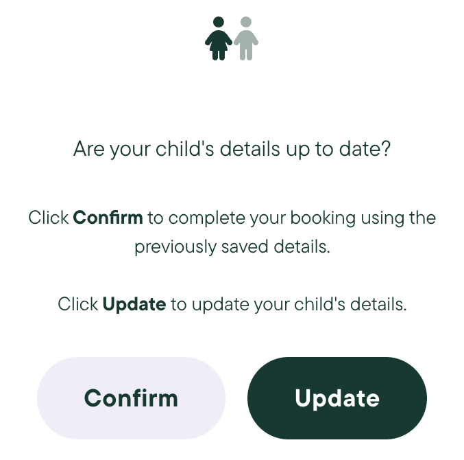 If you have made a booking with us before, you will be asked to confirm you are happy to use the saved details. If this is your first booking or the details have changed, select Update.