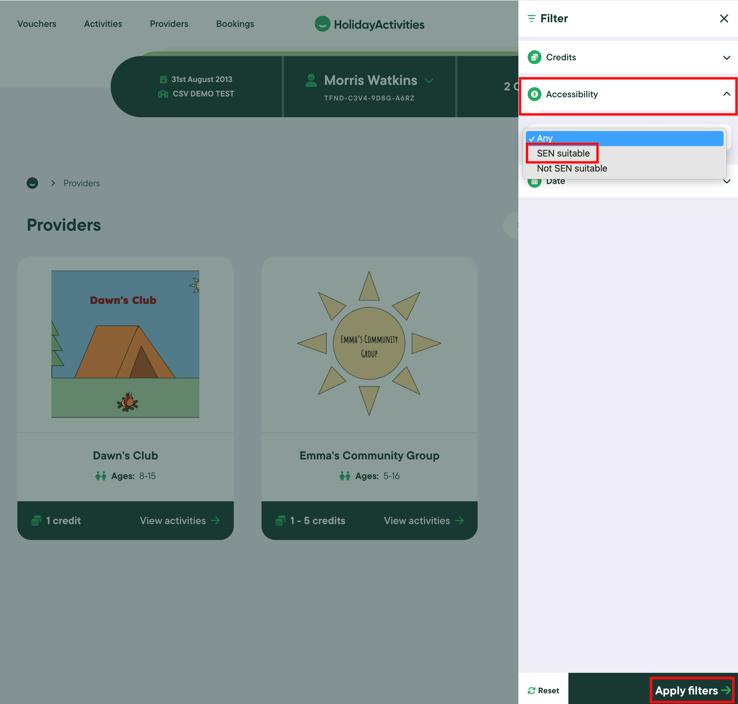 Click Accessibility, SEN suitable and Apply filter. This will then only show activities that are suitable for children with special needs.