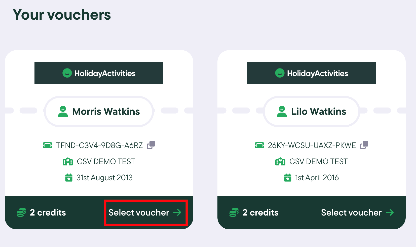 To view your assigned HAF vouchers and see how many credits are available for your child. Select Vouchers. You can also use this option to access the available activities.