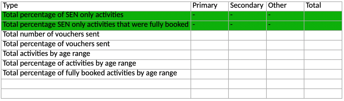This breaks down the total percentage of your activities that were SEN only and how many of those activities were fully booked. These figures will only show as a total.
