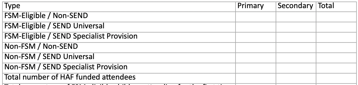 Within the system each child is allocated a “child ID” which is linked to their MIS data record and follows them from holiday period to holiday period. We use this to establish who has attended your HAF provision in previous holiday periods and who is new to HAF. We are then looking at only the children that are marked as FSM eligible to get this percentage calculation. This will only be shown as a total figure, not split by primary and secondary.