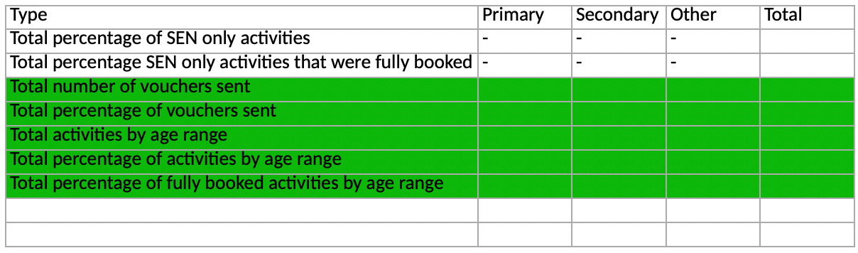 Then the activities are split out by age range (Secondary is classed as anything that is specifically for age ≥12) as a number and percentage as well as the percentage of those activities that were fully booked.