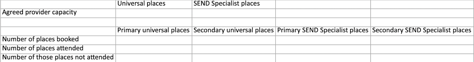 Then it has the number of places booked, attended and not attended split out into Primary and Secondary for both universal and SEND specialist places.